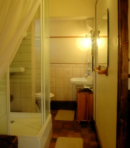 There is a small bathroom, but complete with shower, sink and toilet. Hair-dryer, and Bathrobes completes the room.
